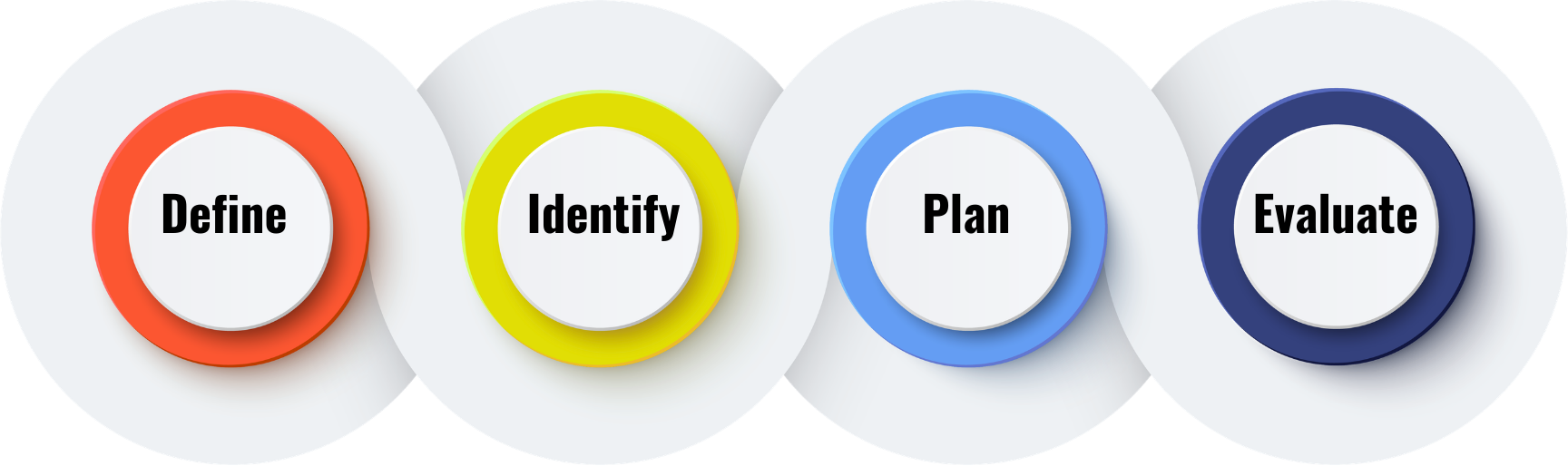 A four-step cycle (define, identify, plan, evaluate) is used to address student outcomes and remove implementation barriers.