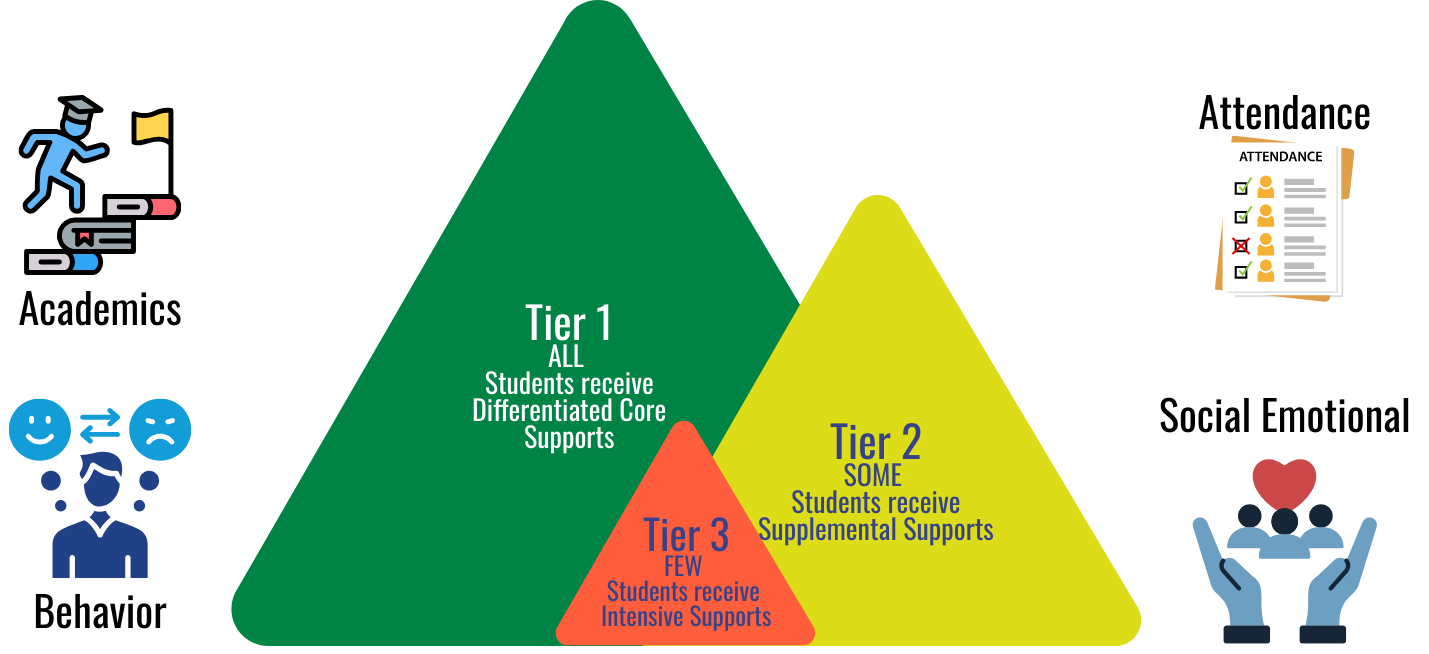 Instruction is organized into three levels: Differentiated Core (all students), Supplemental (some students), and Intensive (individualized, high-level support) for both academics and behavior.